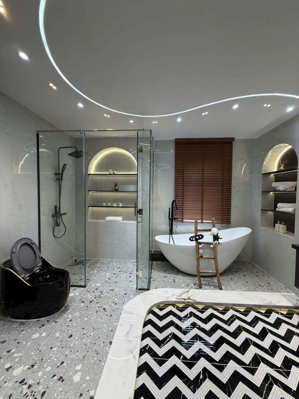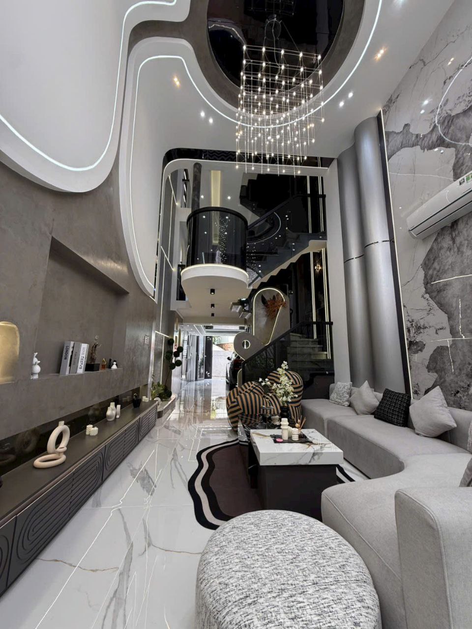 Nhà nằm trong hẻm ô tô đường Nguyễn Tư Giản, Quận Gò Vấp. Kết cấu nhà gồm 1 trệt, 1 lửng, 3 lầu sân thượng. Diện tích 4 x 18m. Nhà có 4 phòng ngủ (PN), 6 WC, phòng thư giãn và có thang máy. Nội thất full. Giá 10.9 tỷ.